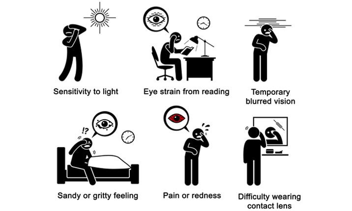 People with dry eyes may experience irritated, gritty, scratchy or burning eyes; a feeling of something in their eyes; excess watering; and blurred vision. Symptoms include: